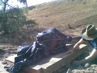 After numerous defeats, the pump and irrigation system is finally working. Saturday we spent some time priming the line with a rigged-up 44 gallon drum and some pipe, but found the water appeared to be running up hill to a large saw cut (which we discovered when water started bleeding out of it). We cut through the rest of the pipe and glued an 80mm joiner in place. Had to wait overnight for it to dry, so couldn't try starting the pump. Early Sunday, braving the frosty conditions, we headed over to and tried starting the pump. We tried turning it over about 20 times, but it refused to start. I began to think it was flooded (due to my 'over priming'). G thought it was a dirty fuel filter. Either way, it didn't start. G went home and I returned with some tools to open the motor up, but I thought I'd give the motor one more go - and it started first try. Elated, I turned the tap on, only to find there was not a drop moving through the system. I thought we'd primed the line and pump - I couldn't work out what was wrong. Then I realised that there was a valve that stopped water flowing back into the dam, and while we'd primed both pipes, the pump itself remained dry. Seems easy now, but before we unscrewed the pressure valve, filled the pump with water and started it up, it was very frustrating. It was successful - one of the best sights of the year was seeing water shooting out of a valve in the vineyard. Now I'll have to look at the irrigation in more detail for repairs.